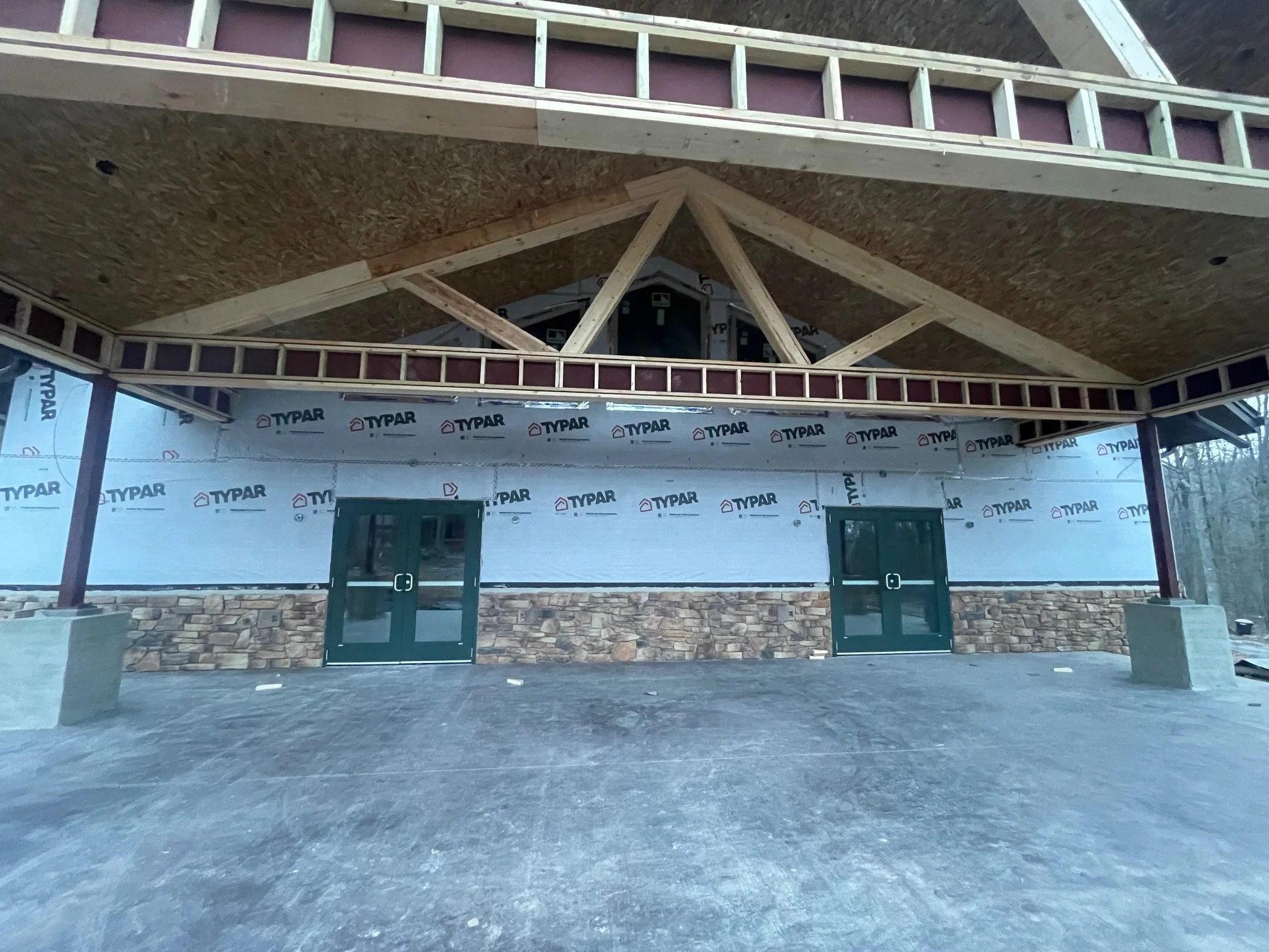 January 15-16 - Stonework continues, porch beams framed in, and the 3phase transformer has arrived at the power company!